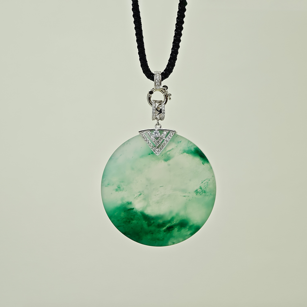圓形絲雲飄無事牌吊墜,直徑 42.86 mm、厚度 6.20,重量 24.32g,搭配 925 純銀鑲鋯石墜頭,比例大器,質感細緻。
